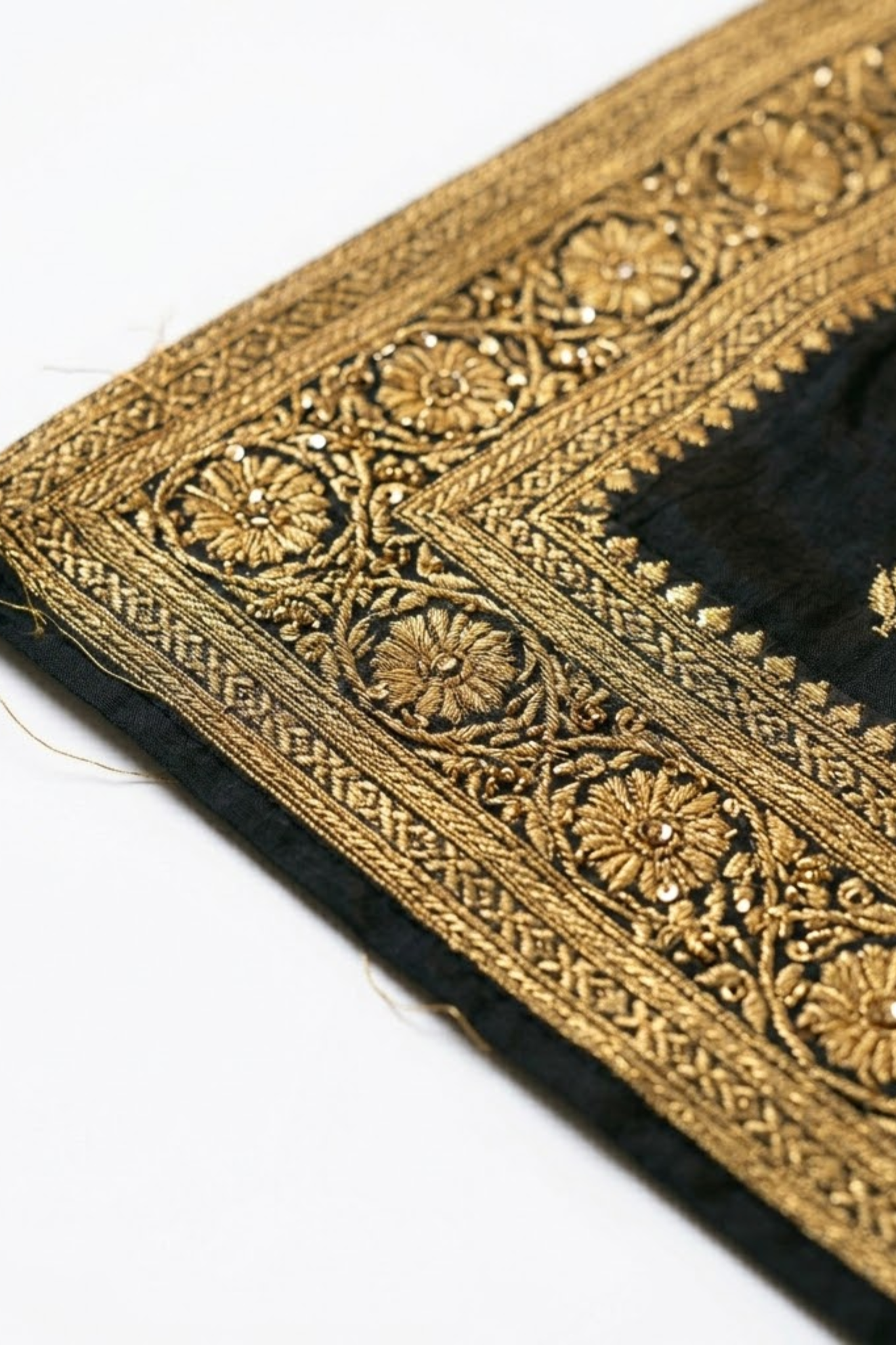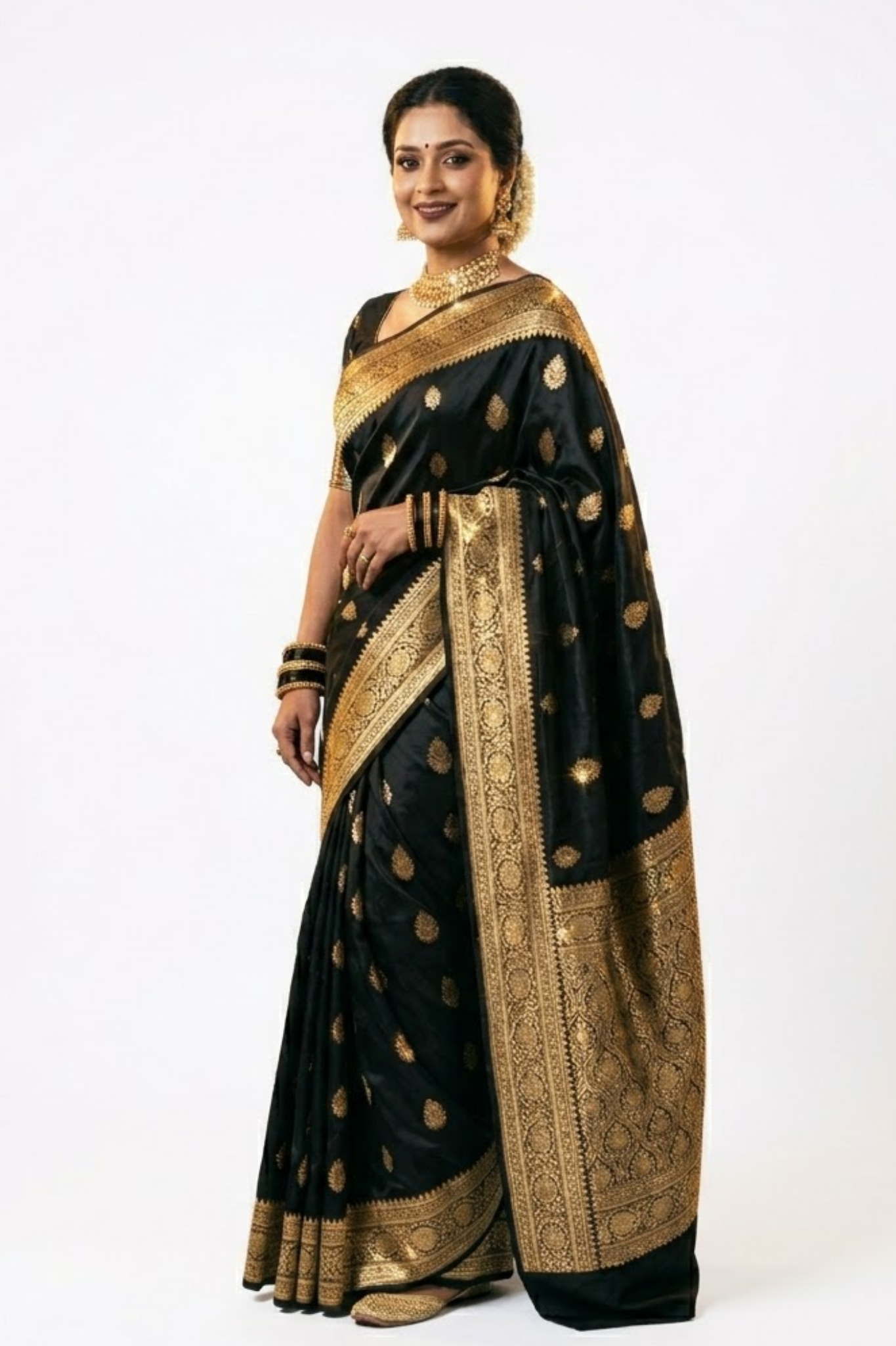 Make a bold and timeless statement with this luxurious black Banarasi silk saree, designed to reflect elegance and royalty. Crafted from premium silk fabric, this saree features exquisite gold zari weaving with traditional motifs spread beautifully across the drape.