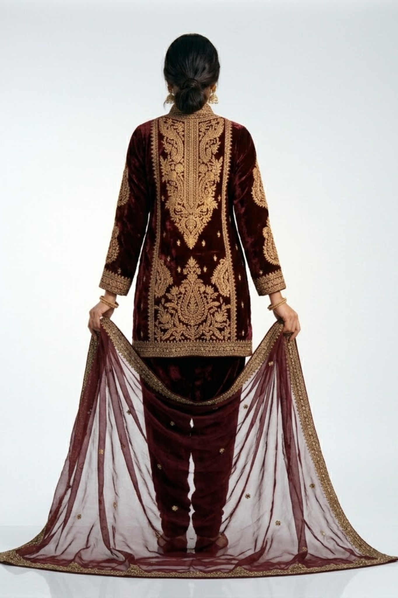Add a touch of luxury to your ethnic style with this maroon velvet kurti set, designed with rich embroidery and a regal finish. Perfect for festive and wedding occasions.