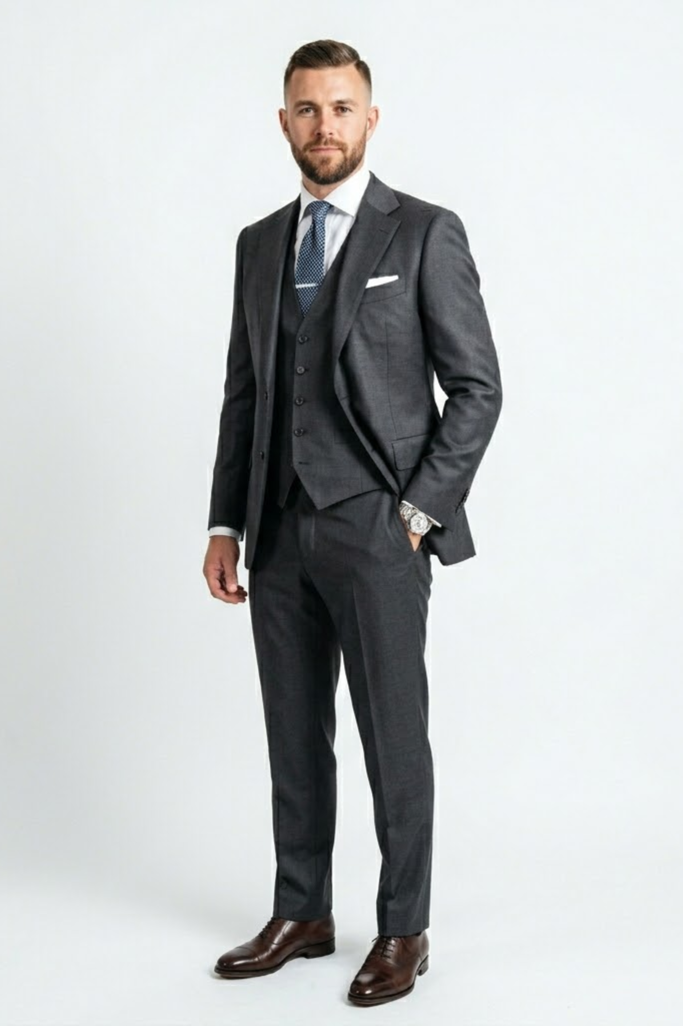 The addition of the waistcoat elevates the overall look, adding depth and class, while the neutral charcoal tone makes it incredibly versatile and easy to style. Every detail, from the sharp lapels to the fine stitching, reflects superior craftsmanship.