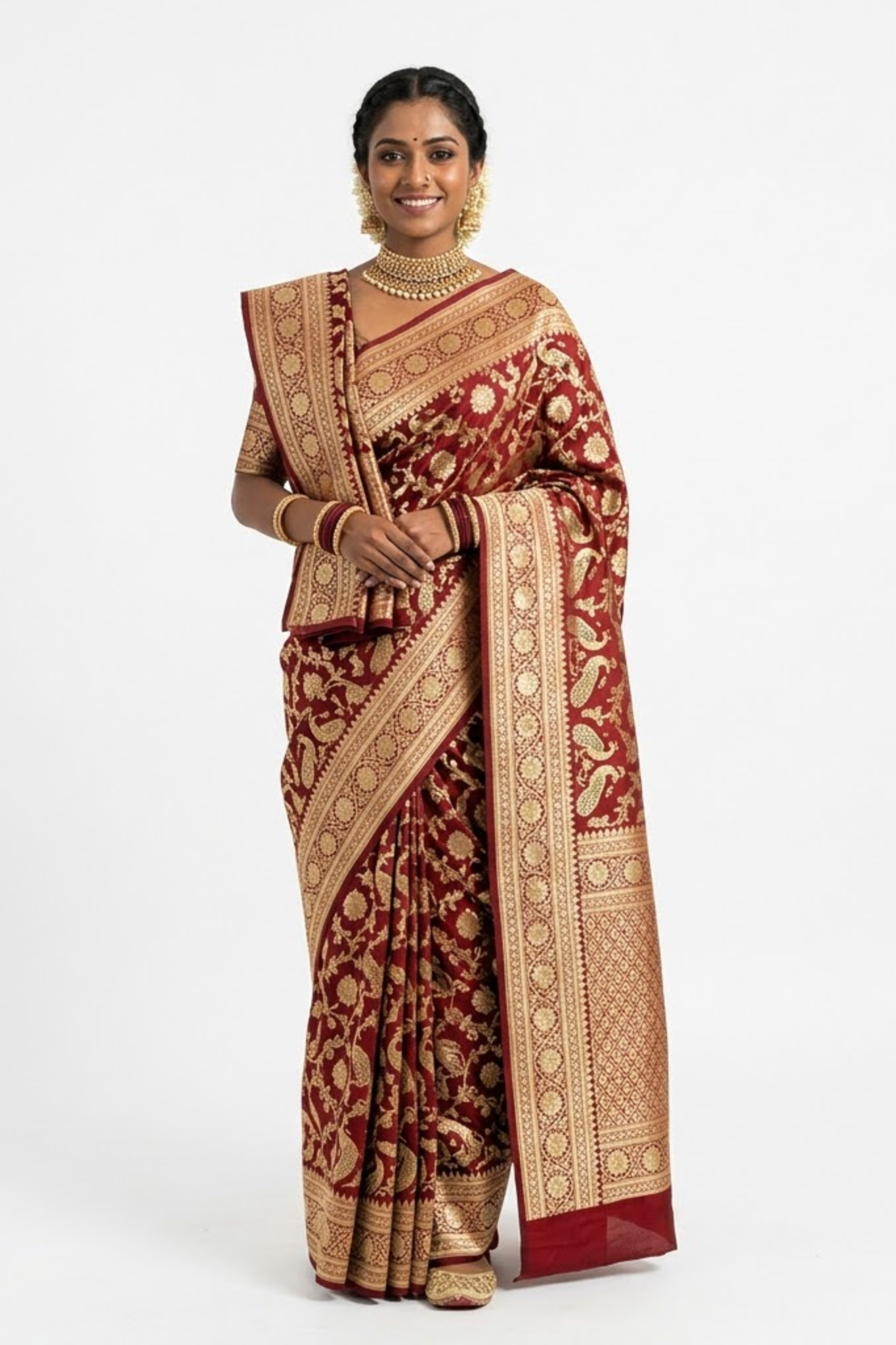 Step into timeless elegance with this royal maroon Banarasi style silk saree, designed to reflect true Indian heritage and luxury. Crafted with premium silk fabric, this saree features intricate gold zari weaving that showcases traditional floral and paisley motifs, giving it a rich and regal appearance.