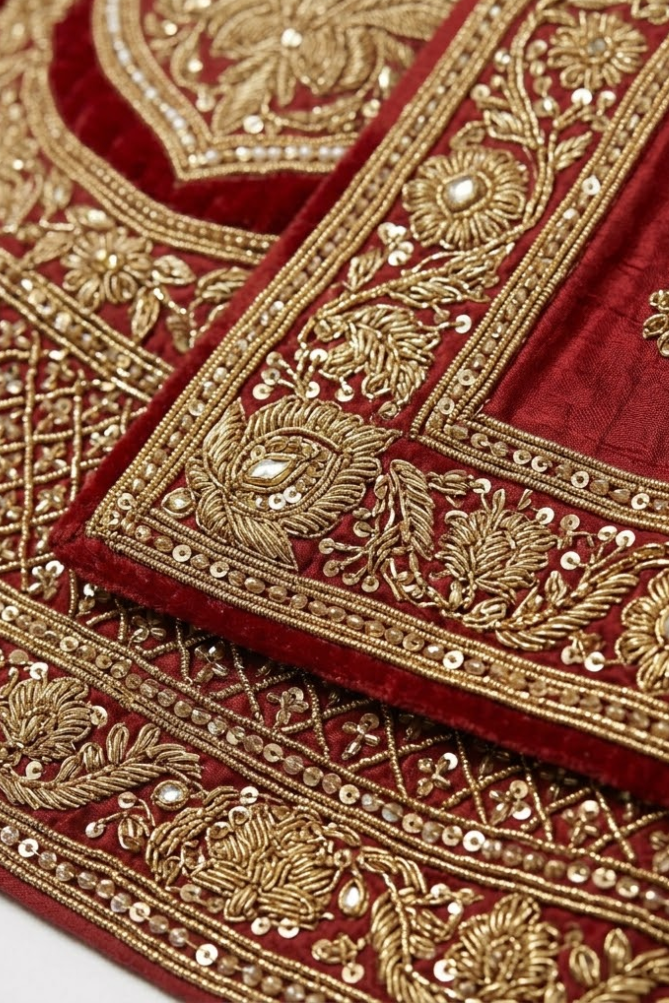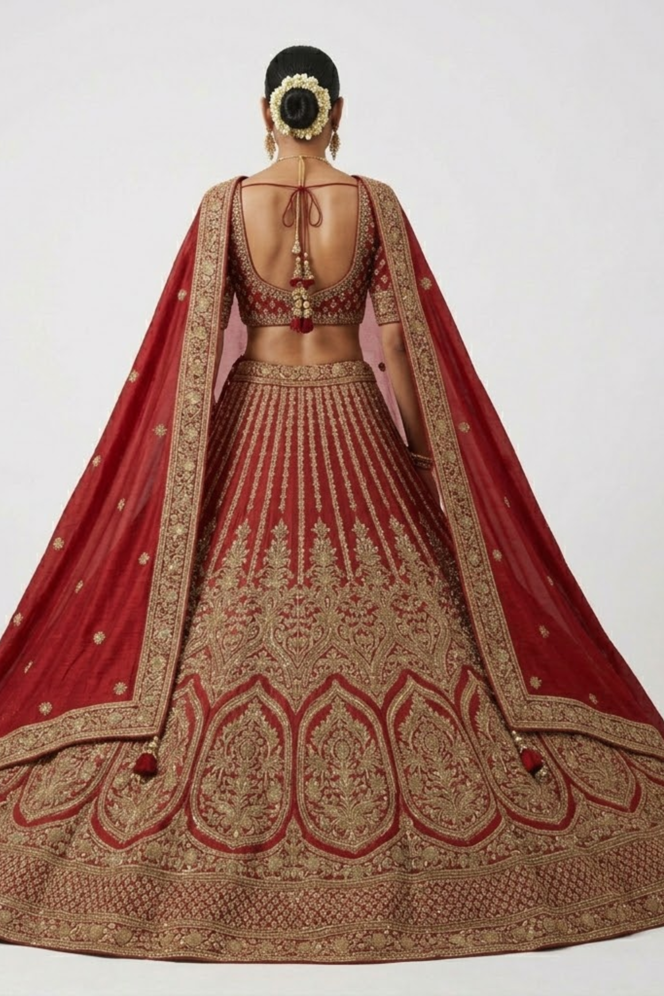 The lehenga features intricate heavy embroidery work that adds depth, richness, and a premium finish to the outfit. Its wide flared silhouette creates a graceful and regal appearance, ensuring you stand out on your special day.