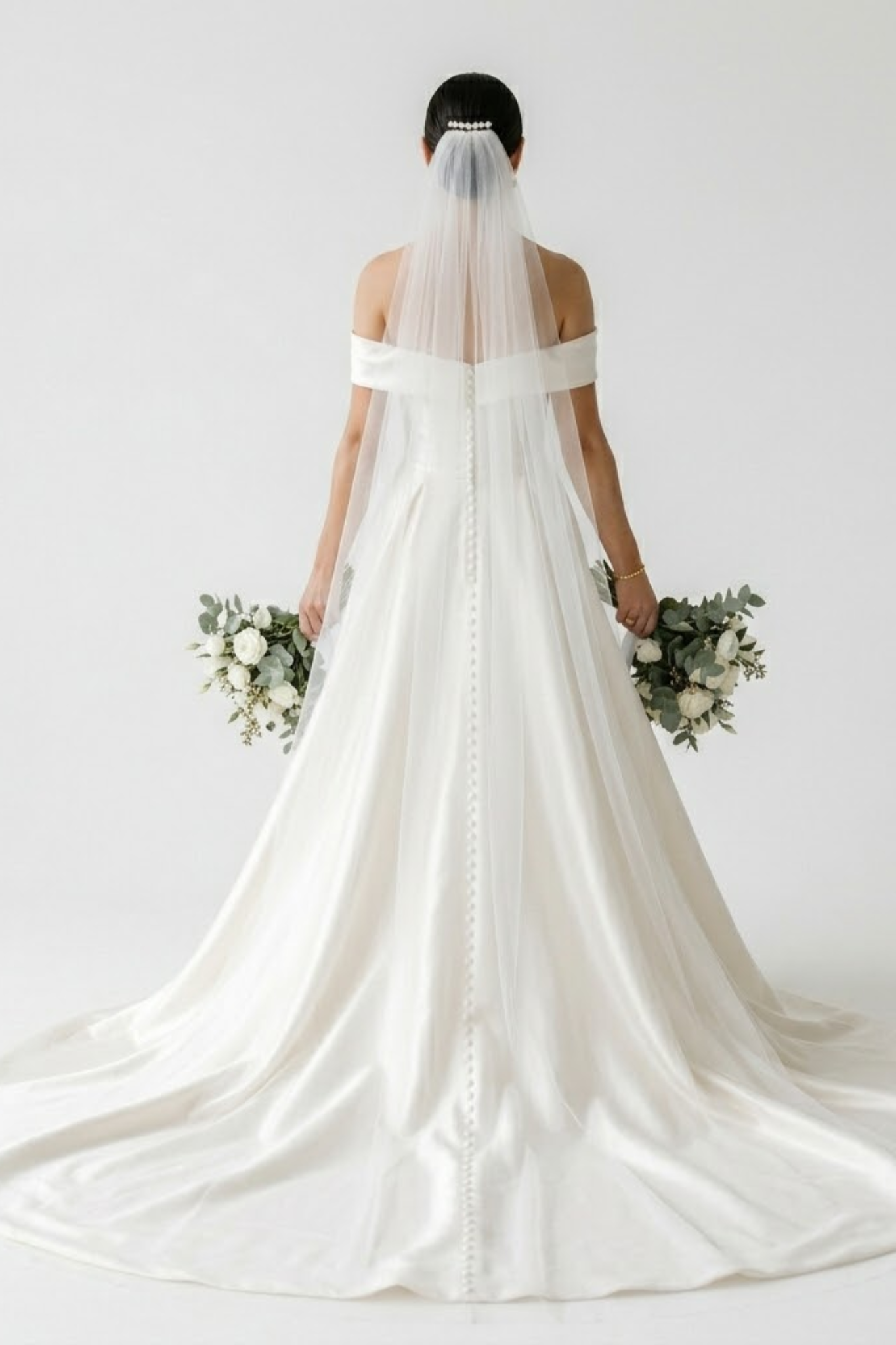 Step into modern elegance with this women’s off-shoulder ivory minimal bridal wedding gown, crafted for brides who appreciate simplicity with sophistication. The soft ivory tone creates a timeless and graceful look, perfect for contemporary weddings.
